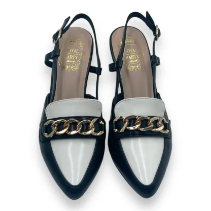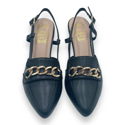 シャープなポインテッドトゥと華やかなチェーンが足元に高級感を